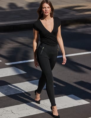 These smart ankle-grazing leggings by Sosandar are crafted from stretchy sculpting fabric that gently shapes your figure for a flattering silhouette. They're designed in a sleek skinny fit, with an elasticated mid-rise waist for a comfortable feel. Two gleaming gold-tone zips at the hips add extra style points.