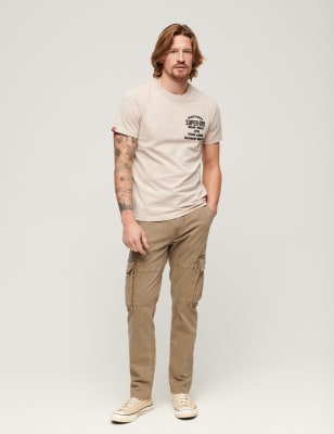These pure cotton cargo trousers from Superdry are a super-cool, comfy choice for casual days. They're cut in a loose fit, with an elasticated waistband and drawcord cuffs. Six pockets provide handy storage while lending a utilitarian vibe. These trousers are complete with pleats at the knees and a reinforced seat.