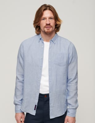 Elevate your wardrobe with this linen-rich shirt from Superdry. It's made in a relaxed fit for comfort and features a practical non-iron finish for ease. With its neat button-down collar and contrast button placket, this shirt retains a traditional feel. It's complete with a practical chest pocket and a casual curved hem.