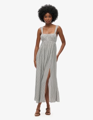 This cotton-rich smock dress from Superdry is an easy-breezy addition to your casual summer collection. It's cut in an effortless relaxed fit, with a feminine v-neckline and tie fastenings at either side of the waist. Lace inserts add pretty detail to the long blouson sleeves and the mini-length skirt, which features a deep tier.