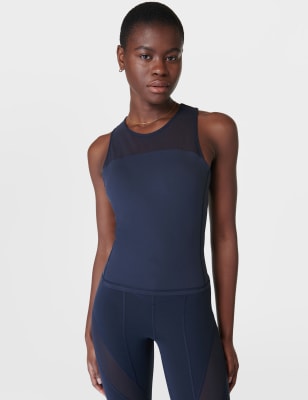 The Zero Gravity running vest top from Sweaty Betty blends comfort with a sporty style. Relaxed fit with a round neck and a cool sleeveless shape. Layered design for flexible wear. Mesh racerback provides increased airflow.