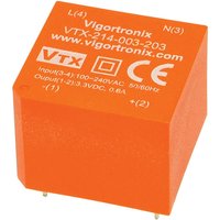 Vigortronix VTX-214-003 3W Miniature SMPS AC-DC Converter 3.3 - 48V - Vigortronix VTX-214-003-212, This Vigortronix AC-DC 3W single output miniature switched mode power supply (SMPS) is designed for applications where space is limited, thanks to the encapsulated design of the module which boasts over power, over current and short circuit protection. This very small 17g PCB mounted SMPS is not only cost-effective, but also boasts a host of features, such as 3600Vrms primary to secondary isolation, low standby power (<0.3W), -25°C to +70°C operating temperature (full load), low ripple and noise and >74% efficiency. Vigortronix VTX-214-003-212 3W Miniature SMPS AC-DC Converter 12V Output