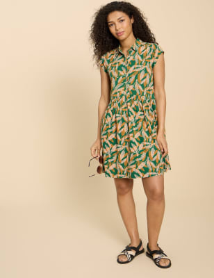 Embrace laid-back styling with this organic cotton-blend jersey shirt dress from White Stuff. It's cut in a comfy regular fit, with a neat collared neckline and a button-through fastening. The short-sleeved design falls to a versatile midi length and is decorated with an all-over print for a playful look.