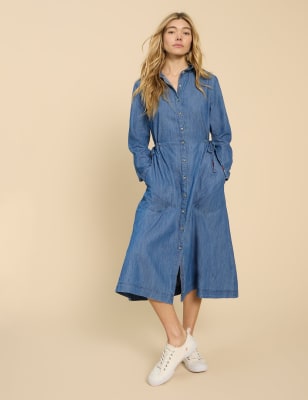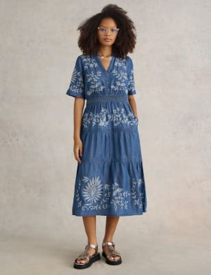 Crafted from breathable pure cotton, this midi denim dress from White Stuff is all about off-duty charm. It's crafted in an easy relaxed fit, complete with romantic ruffled three-quarter-length sleeves. The bodice features tonal embroidery and a smart v-neckline, plus a neat button fastening. For a flattering silhouette, the piece is gathered at the empire waistband, with the tiered skirt providing extra shaping detail.
