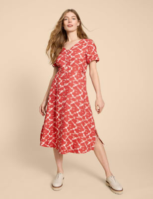 Showcasing a bold monochrome print, this linen-rich midi dress from White Stuff is all about eye-catching elegance. This midi-length number is cut to an easy regular fit, with a flattering wrap-front, v-neck design. A self-tie belt cinches the waist for added definition, while turn-ups on the short sleeves keep things feeling laidback. For a practical finish, the piece is complete with must-have side pockets.