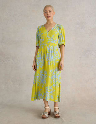 White Stuff Women's Linen Rich V-Neck Midi Waisted Dress - 6 - Yellow Mix, Yellow Mix