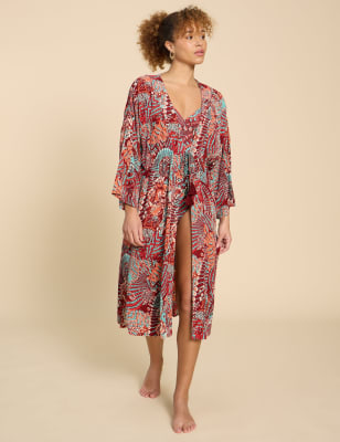 For sophisticated poolside lounging, choose this lightweight beach cover-up from White Stuff. It's made in an easy regular fit, with a v-neck leading to an elegant twist front. Three-quarter kimono sleeves and a long length bring a breezy feel. The style is finished with a bold monochrome print.