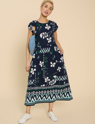 White Stuff Women’s Pure Cotton Printed Midi Tiered Shirt Dress – 10REG – Navy Mix, Navy Mix